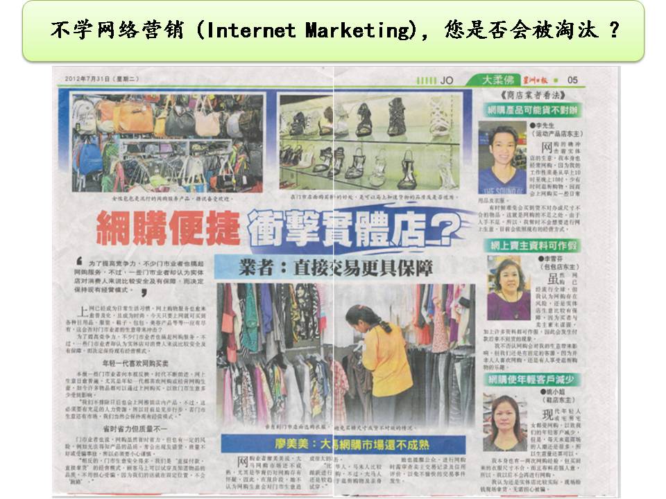• 初级课程:8小时 - >6小时课程 ;2小时考试电子商务101网络供应商网络顾客网络付款网络物流(代购/代运/充值)网络商店博客管理网上赚钱加盟/代理寻找市场查找产品